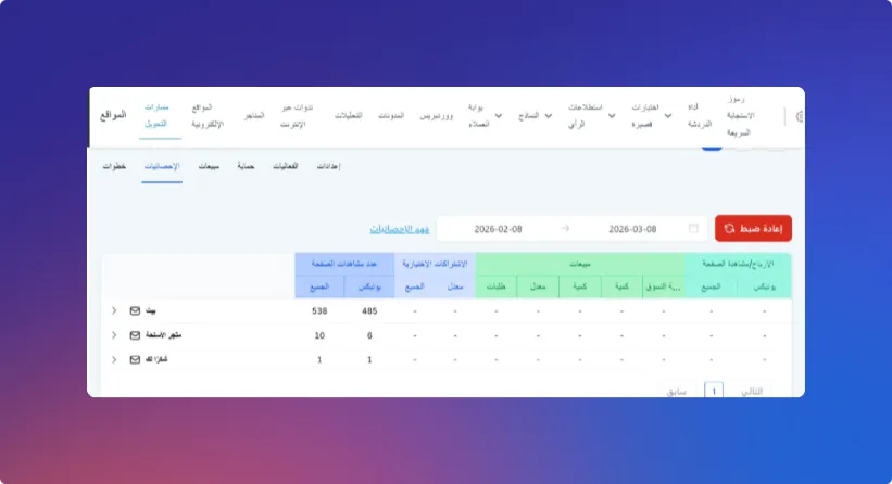 ا حاجة لاستخدام أدوات تحليل خارجية — يمكنك متابعة زيارات المواقع وصفحات الهبوط والنماذج مباشرة من داخل المنصة، مع تقارير واضحة تساعدك على فهم أداء موقعك وتحسين نتائجه.